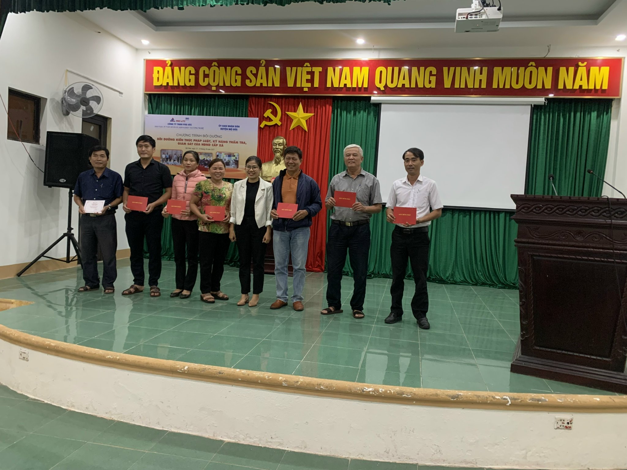 Kết thúc khóa học đại diện Cơ quan Tổ chức – Nội vụ huyện Mộ Đức và giảng viên của Công ty TNHH PRO ATC đã trao giấy chứng nhận cho học viên.